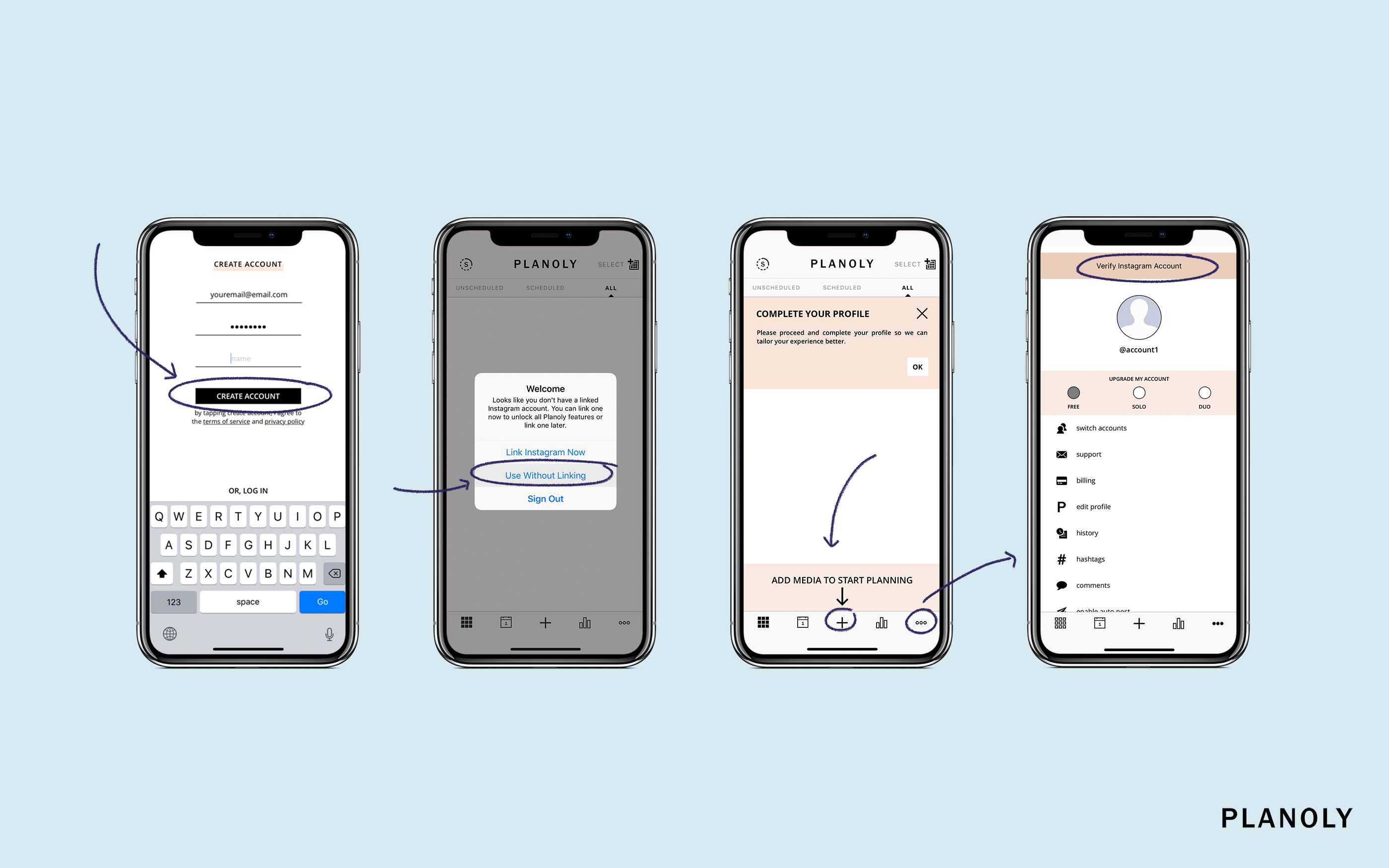This new sign up option is perfect if you want to test out PLANOLY without signing in to your Instagram account, as it allows new signups to use PLANOLY without linking their Instagram account! Users can upload content to visualize their grid and test out the app before deciding to link an Instagram account with PLANOLY. See more details about this new feature and how to use it below. This feature is available on PLANOLY's web dashboard, iOS, and Android - upon signing up, you can choose the option to 'Use Without Linking' in order to defer linking an Instagram account.